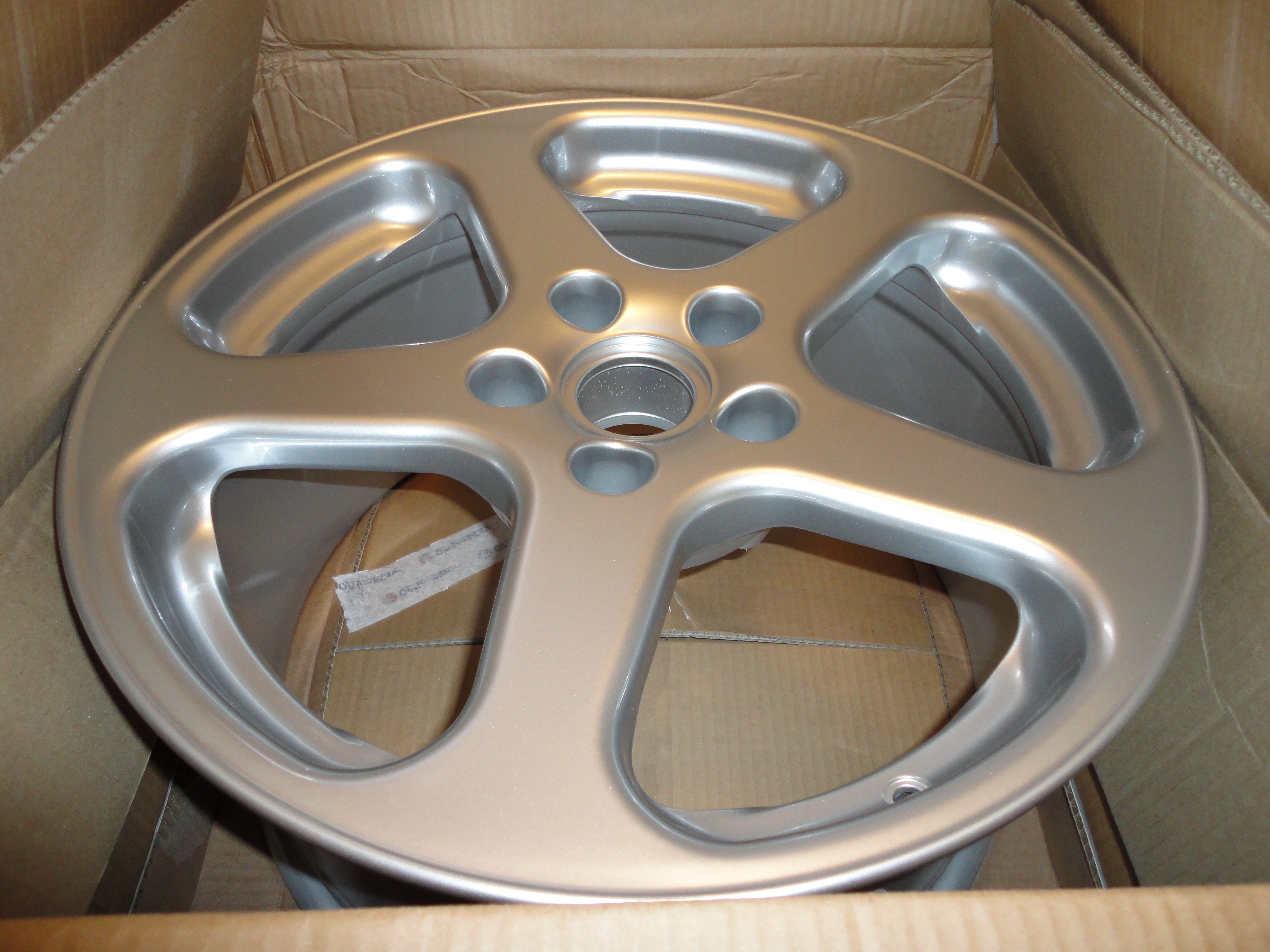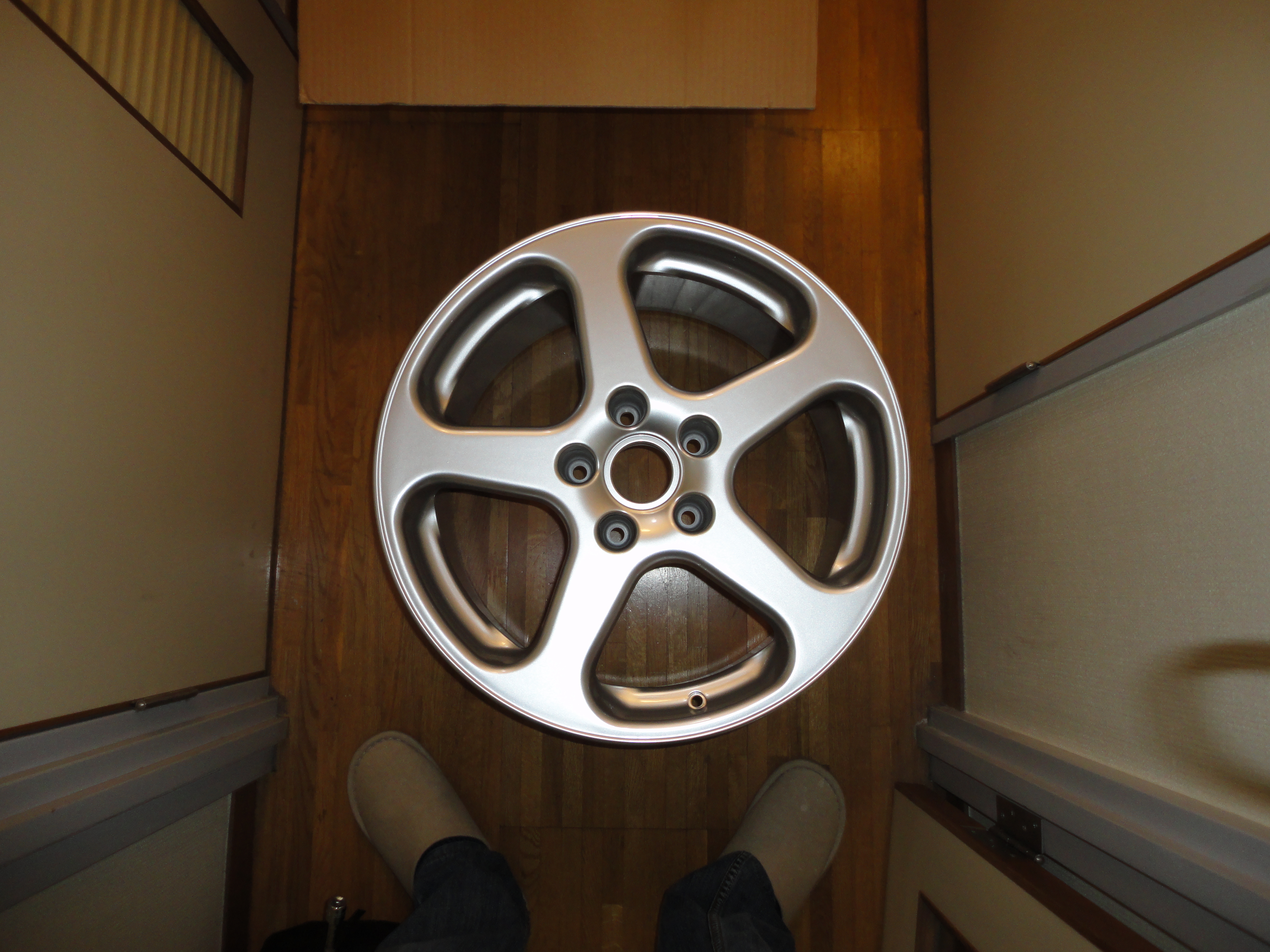 なんで地味な造形のコレかというと、ポルシェ純正のパチもんはちょっとアレですし、アメリカーンな2ピース深リムクロームメッキは趣味的な問題と、ますます重くなりそうなので避けました。軽量が謳い文句の物はやっぱりお高いですし。ま、コレもRufのパチもんらしいですが(^_^;)。
