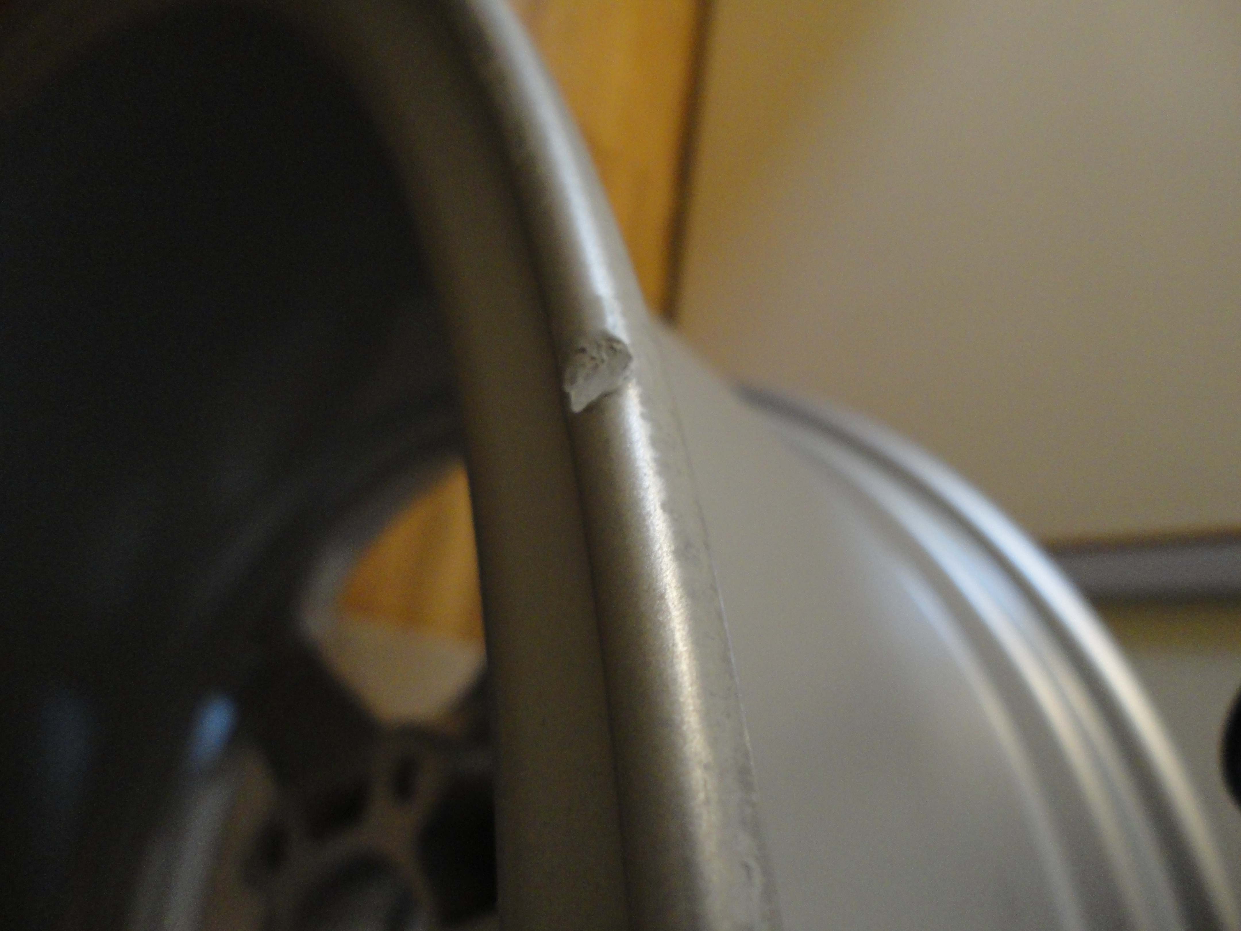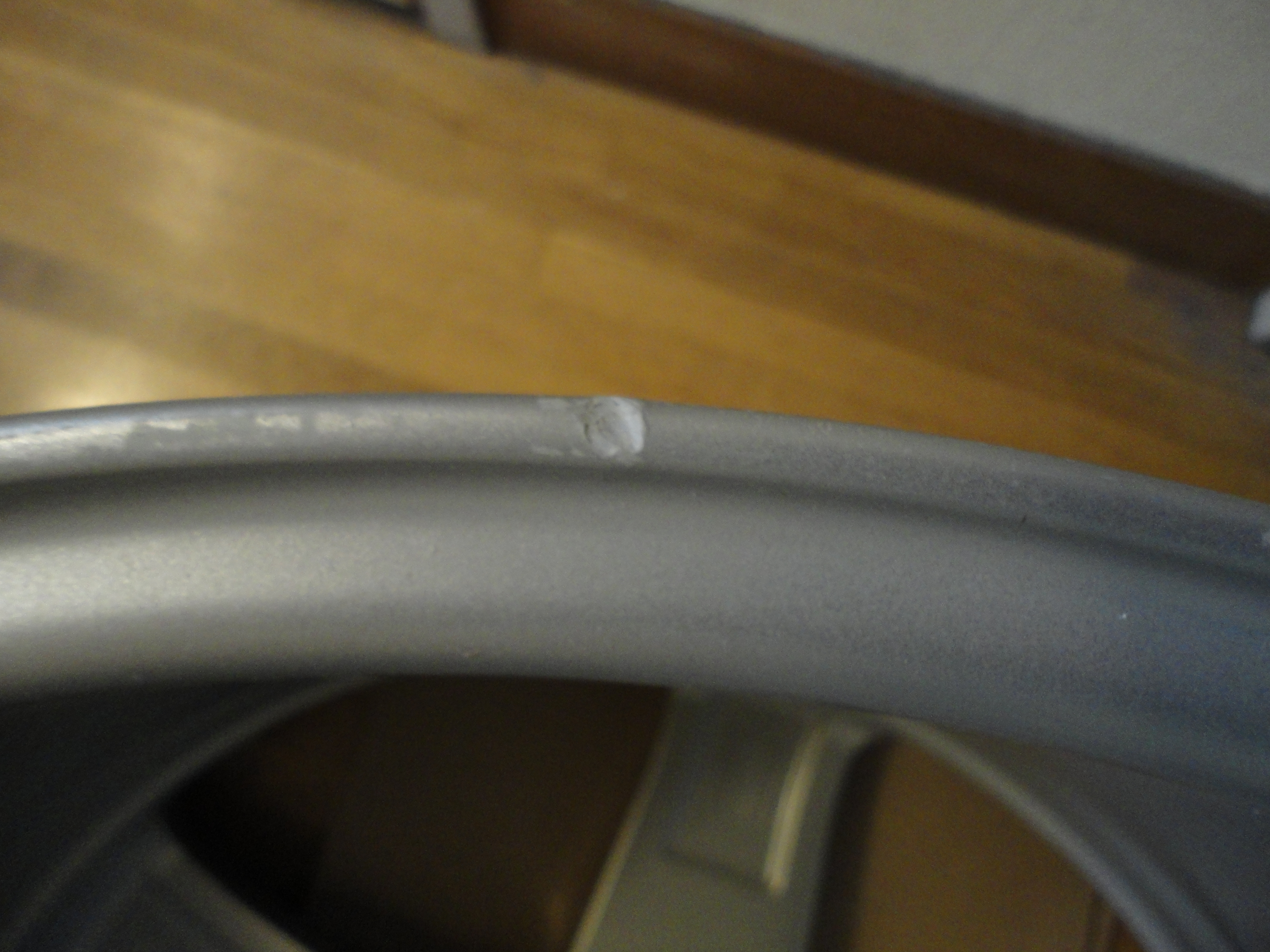 段ボール箱に横にして、インナーリムが下に入っている訳ですが、置いたときに下側に小石でもあったのでしょうか、リムに凹みが。内側ですから見える訳ではないですし、エア漏れしたりバランスに問題が出るほど歪みがあるようには思えませんけど、一応お店にはどうするか問い合わせしておきますかね。