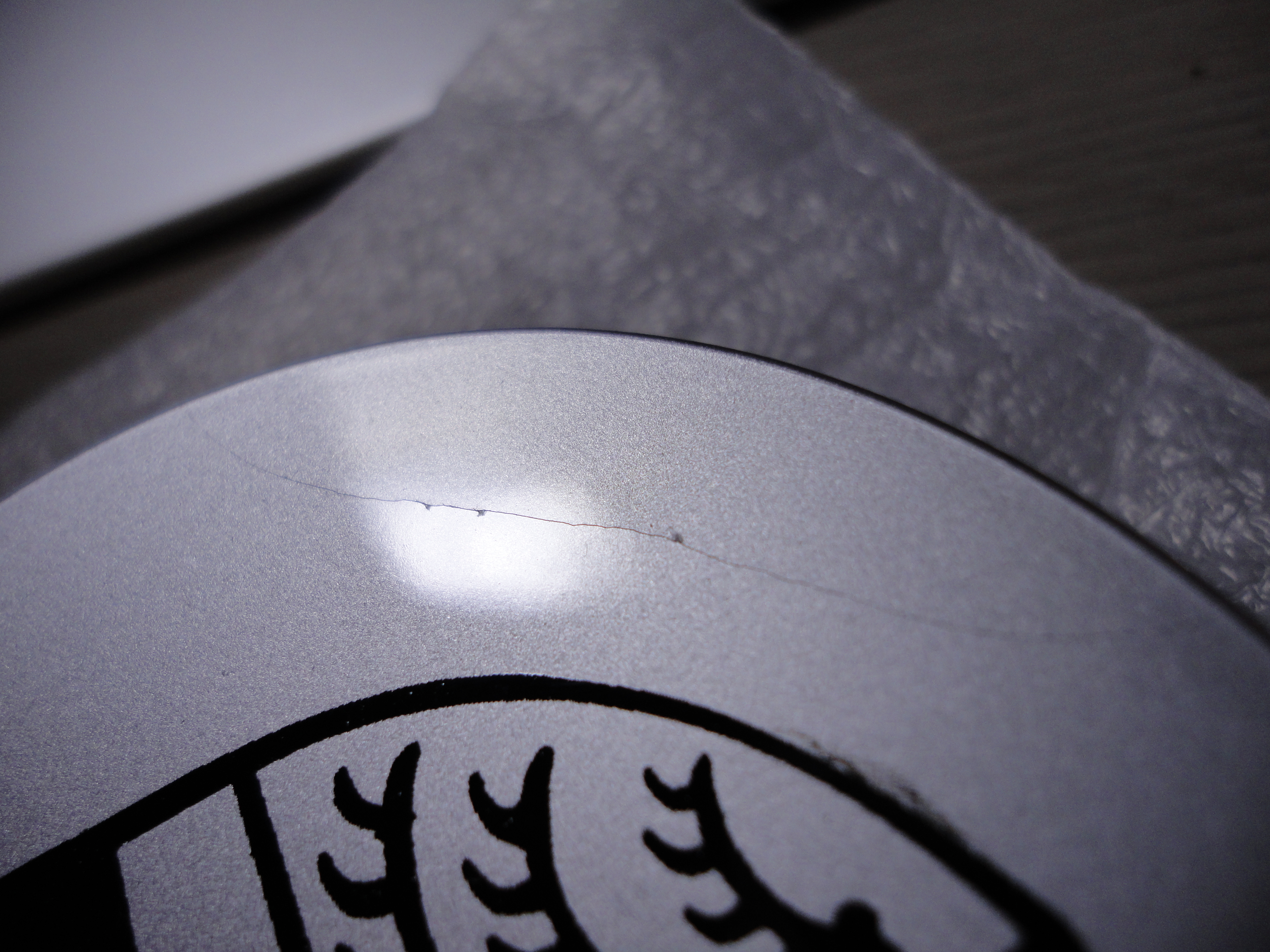 さらに、ホイールのセンターキャップも付属しているのですが、それもどうやら箱の中で押されたようで、一つクラックが入っていました。これは使っているうちに割れが広がって外れる可能性が高いので交換してもらう必要がありますね…。